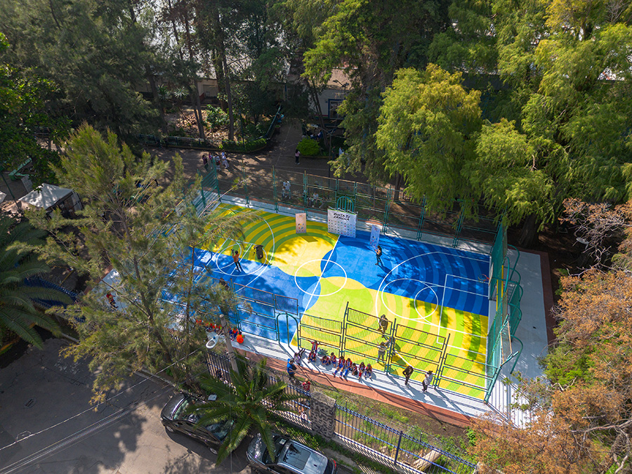 • Patios escolares. Donde se transforman espacios monofuncionales, limitados a canchas o columpios, en lugares de juego diverso que fomentan distintas habilidades y ayudan a combatir el bullying.