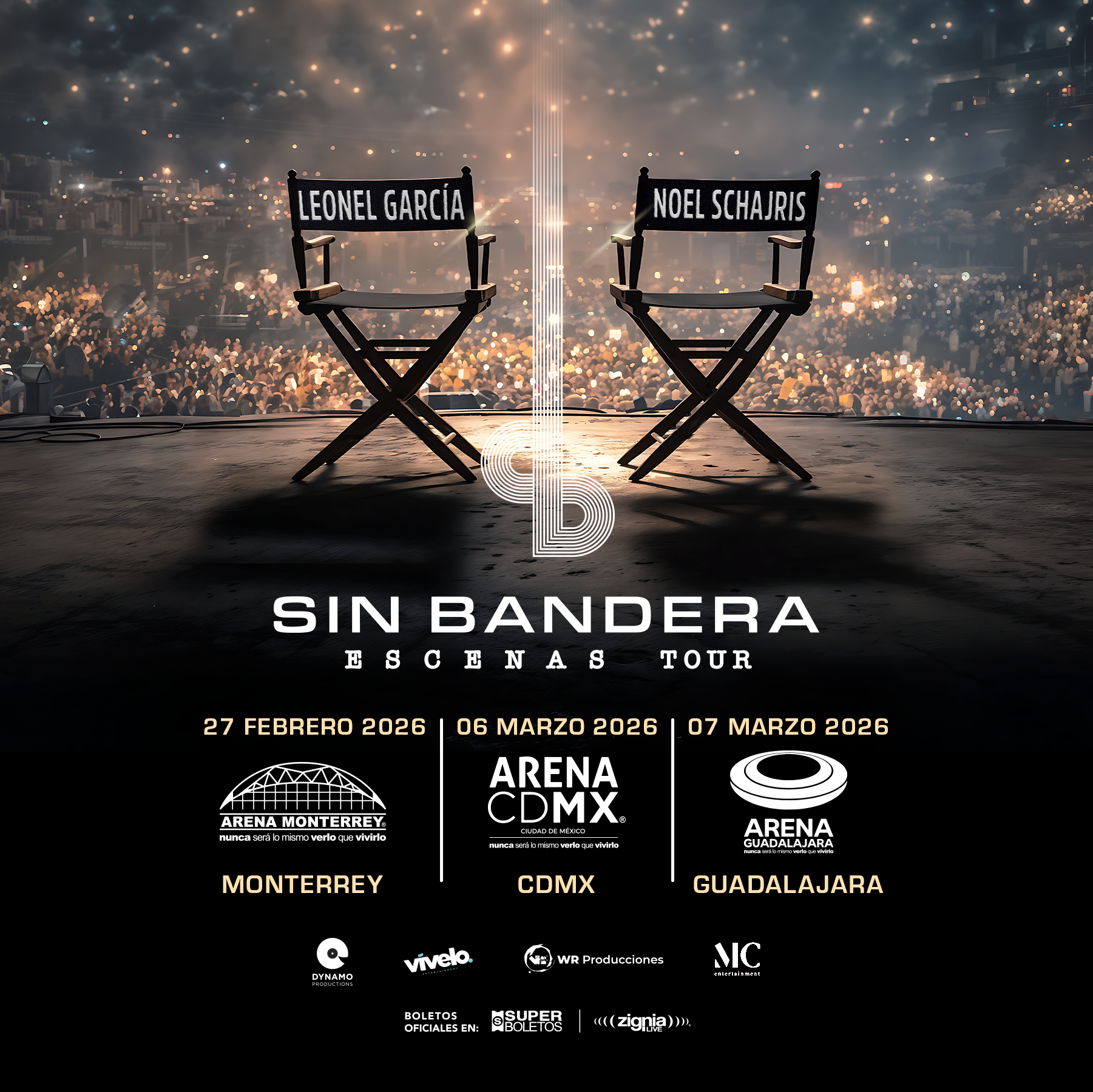 Con 25 años de trayectoria, millones de discos vendidos, giras que han recorrido el mundo y canciones que se han convertido en himnos generacionales, Sin Bandera anuncia su esperado regreso a los escenarios con el ESCENAS TOUR, una gira que promete ser un viaje emotivo y lleno de nostalgia, pero también de frescura con los temas inéditos de su próximo álbum de estudio. El tour llegará a las tres arenas más importantes del país: Arena Monterrey, el 27 de febrero de 2026; Arena CDMX, el 6 de marzo de 2026; y Arena Guadalajara, el 7 de marzo de 2026 a las 21:00 hrs.